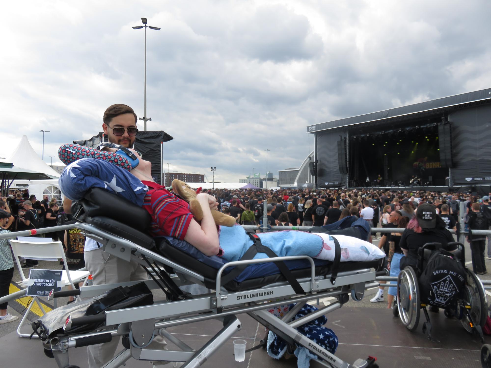 Als wir schließlich auf dem Festivalgelände ankamen, führte uns der Weg direkt zur Rollstuhl-Empore. Dort hatten wir den perfekten Überblick über das Geschehen – die Menge von tausenden Metal-Fans, die im Einklang zur Musik der ersten Band jubelten, der strahlende Sonnenschein und der freie Blick auf die riesige Bühne. Für Marcel war es der ideale Platz, um die einzigartige Atmosphäre des Festivals aufzunehmen.
