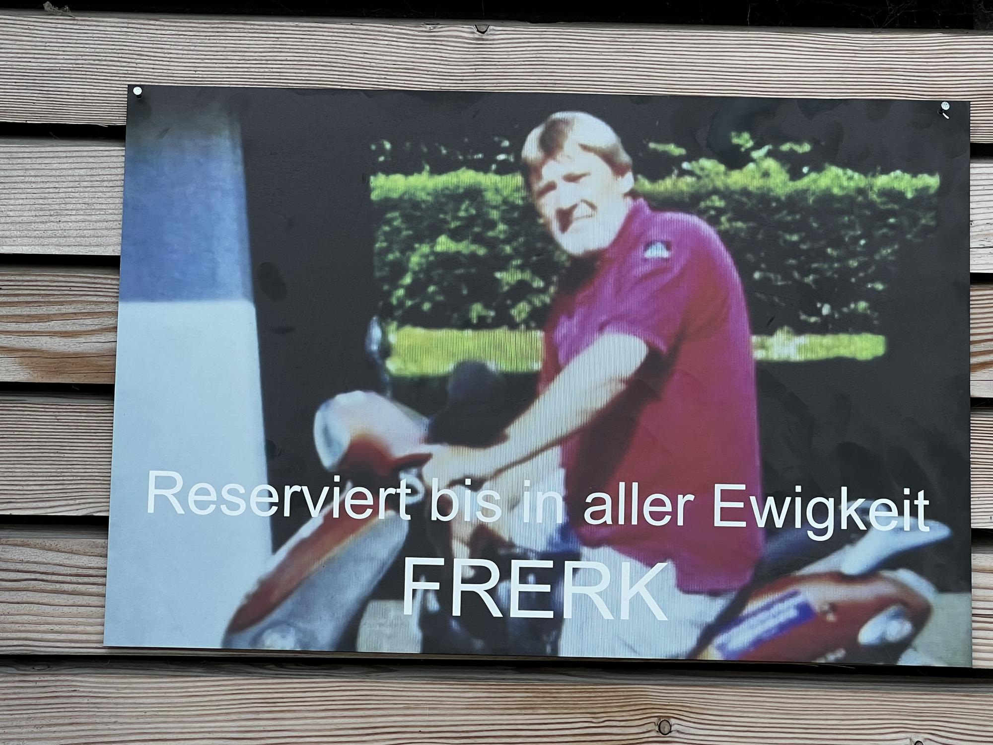 Weiter ging es zum @Bistro Fuhlehörn, wo ein liebevoller Empfang für den langjährigen Freund und Stammgast bereitet worden war. An Frerks Lieblingssitzplatz findet man jetzt ein Foto von ihm mit der Aufschrift „Reserviert bis in alle Ewigkeit – Frerk“.
