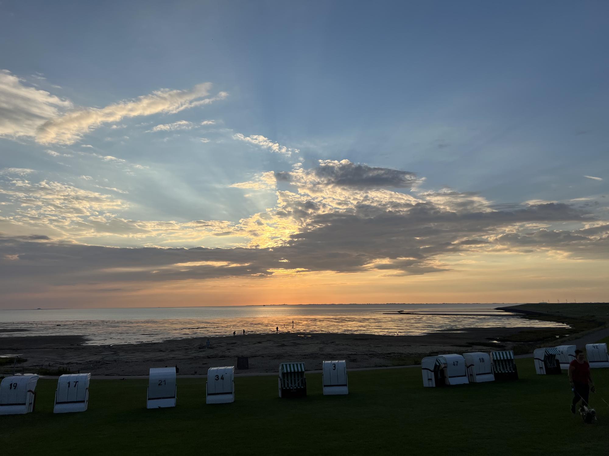 Einige Zeit später brachten wir unseren Gast auf die andere Seite des Deichs ans Wasser. Lange genoss er die Aussicht und wünschte sich dann, zurück zur Feier gebracht zu werden. Danach blühte er sichtbar auf, aß und trank ein wenig und unterhielt sich lebhaft mit Freunden und Familie, bis es Zeit war, sich zu verabschieden und aufzubrechen. Ein paar Minuten genossen wir zu dritt noch den traumhaften Sonnenuntergang, bis Frerk sagte, jetzt sei es gut.