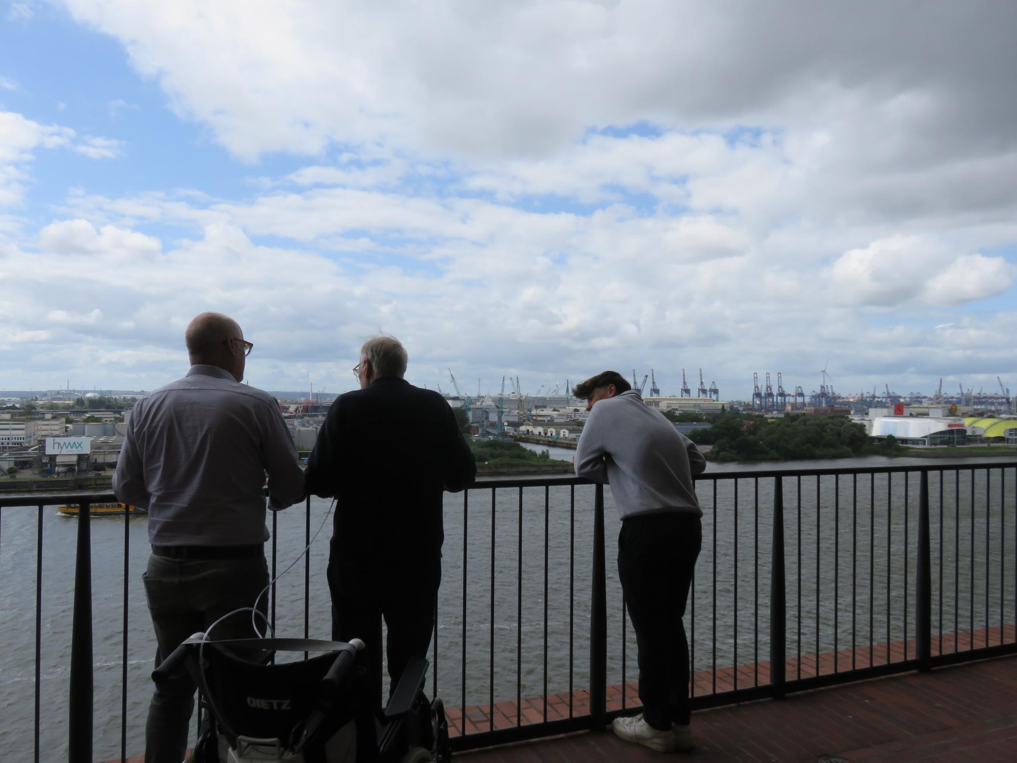 Bei strahlendem Sonnenschein erreichten wir die Elbphilharmonie, wo Schwiegertochter und Enkelsohn bereits warteten. Mit dem Fahrstuhl ging es hinauf auf die 37 Meter hohe Aussichtsplattform. Dort genossen wir gemeinsam den Blick über Hamburg. Die frische Luft tat Hansi sichtlich gut. Trotz seiner Lungenerkrankung kam er ohne zusätzlichen Sauerstoff aus. Seine Gesichtshaut war rosig, seine Haltung gelöst.