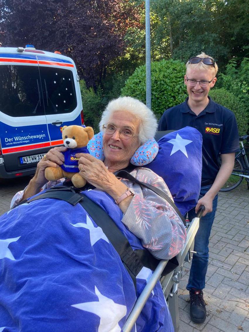 Die Zeit verging wie im Fluge und wir machten uns langsam auf den Rückweg zum Auto. Aber halt, das Wichtigste fehlte ja noch! Kurze Zeit später hielt Frau B. freudestrahlend ihr lang ersehntes Krabbenbrötchen in der Hand. Noch ein gemeinsames Abschiedsfoto und der Rückfahrt stand nichts mehr im Wege. Für einen musikalischen Ausklang des Tages sorgten Frau B. und ihr Sohn, die gemeinsam im Wünschewagen Lieder wie „Wunder gibt es immer wieder“ von Katja Ebstein und „Über den Wolken“ von Reinhard Mey sangen. Zum Schluss hörten wir „Liebeskummer lohnt sich nicht“ von Siw Malmkvist. Dem stimmten wir zu, Liebeskummer lohnt sich nicht. Aber eine letzte Fahrt nach Büsum auf jeden Fall. Und das wusste auch Frau B.