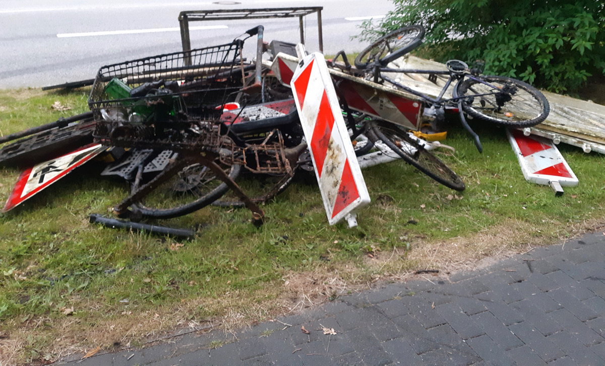 Bei entsprechenden Einsätzen am 14. Juni und am 1. Juli suchten mit Pressluftflaschen ausgestattete Kräfte der Tauchereinsatzstaffel des ASB jeweils im Bereich der Emil-Lueken-Brücke nach gesunkenen Abfällen und machten dabei eine erschreckend große Ausbeute: Zehn Fahrräder, ähnlich viele Baustellenabsperrungen und mehrere Baustellenfüße förderten die Froschleute zu Tage. Aber auch Verkehrsschilder, Einkaufswagen und zwei Tische hatten sie nach Ende der Unterwassermission ans Ufer des Kleinen Kiel gehoben.