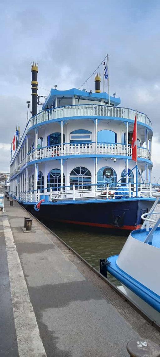 Am Hamburger Hafen legte der majestätische Schaufelraddampfer Louisiana Star an, und trotz der Schnelllebigkeit, die von Frau D. nicht unbemerkt geblieben war, wo alles erneuert wird, die Straßen und die Stadt Hamburg sich in kürzester Zeit so verändert haben, tauchten wir plötzlich in eine nostalgische Umgebung auf dem Schiff ein. Große Kerzenleuchter, tiefrote Teppiche, Glanz und Glamour von vergangenen Zeiten erinnerten uns an den eigentlichen Sinn des Lebens.